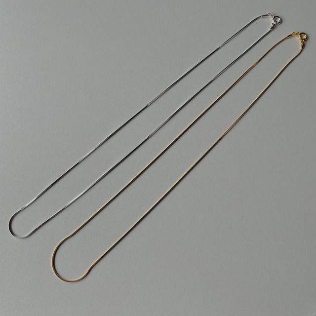 スネークチェーンのシンプルなネックレスはお洋服を選ばずに合わせやすい万能なアイテム。 シンプルなタンクトップやTシャツに合わせて肌に馴染む素材感をお楽しみください。 こちらの商品はsilver925、またはsilver925をベースに16KGPでコーティングしております。 無垢なシルバーの時間の経過に伴い変化する風合いをお楽しみください。 color:silver,gold size:全長40cm material:silver925,16k gold plated silver925 全て平置きで採寸しております。 測る位置によって1〜2ミリの差が生じる場合がございます。 モニターの環境や撮影時の照明によって実物と多少色合いが異なる場合がございます。 素材の特性上、強く折り曲げますと破損に繋がり兼ねますのでご注意下さい。