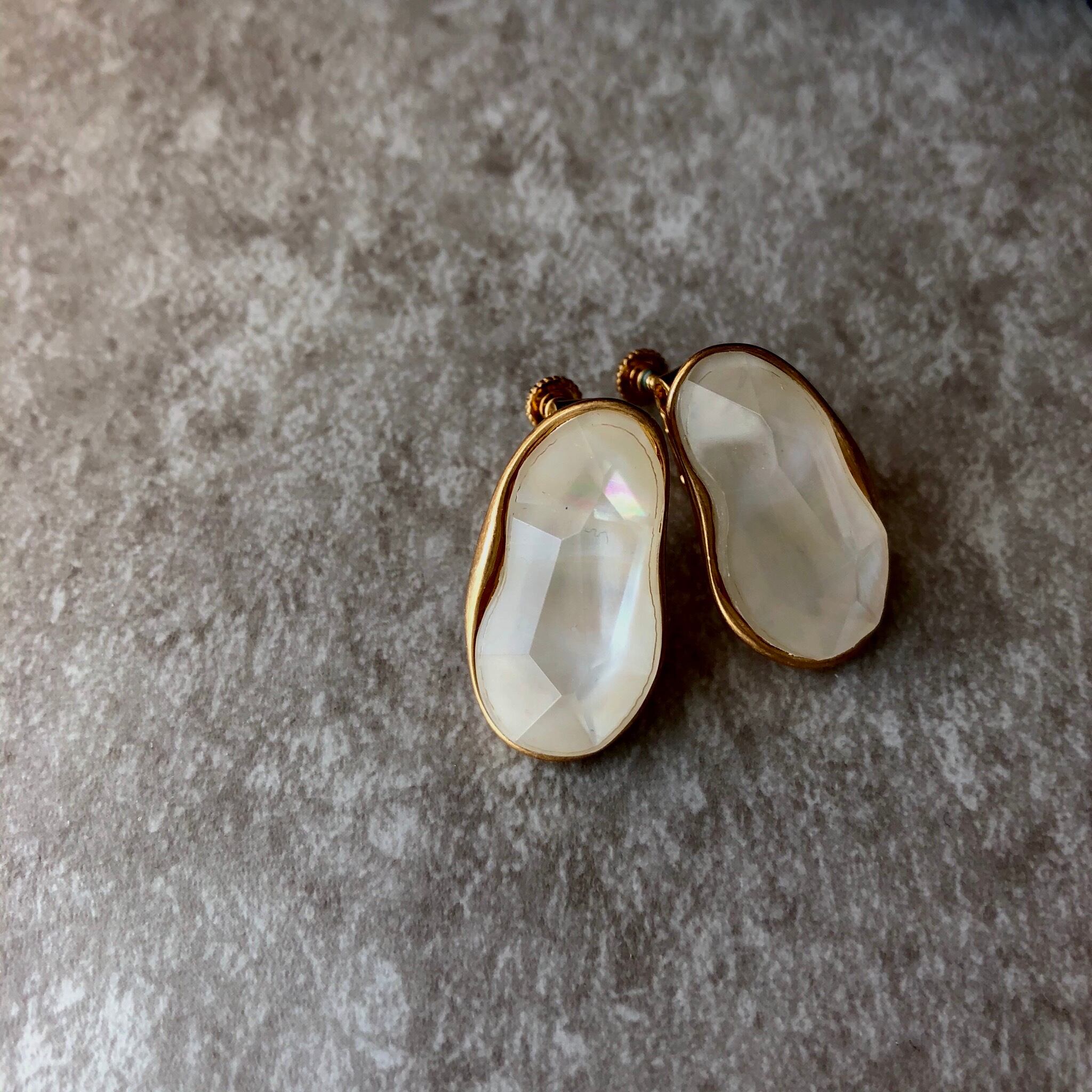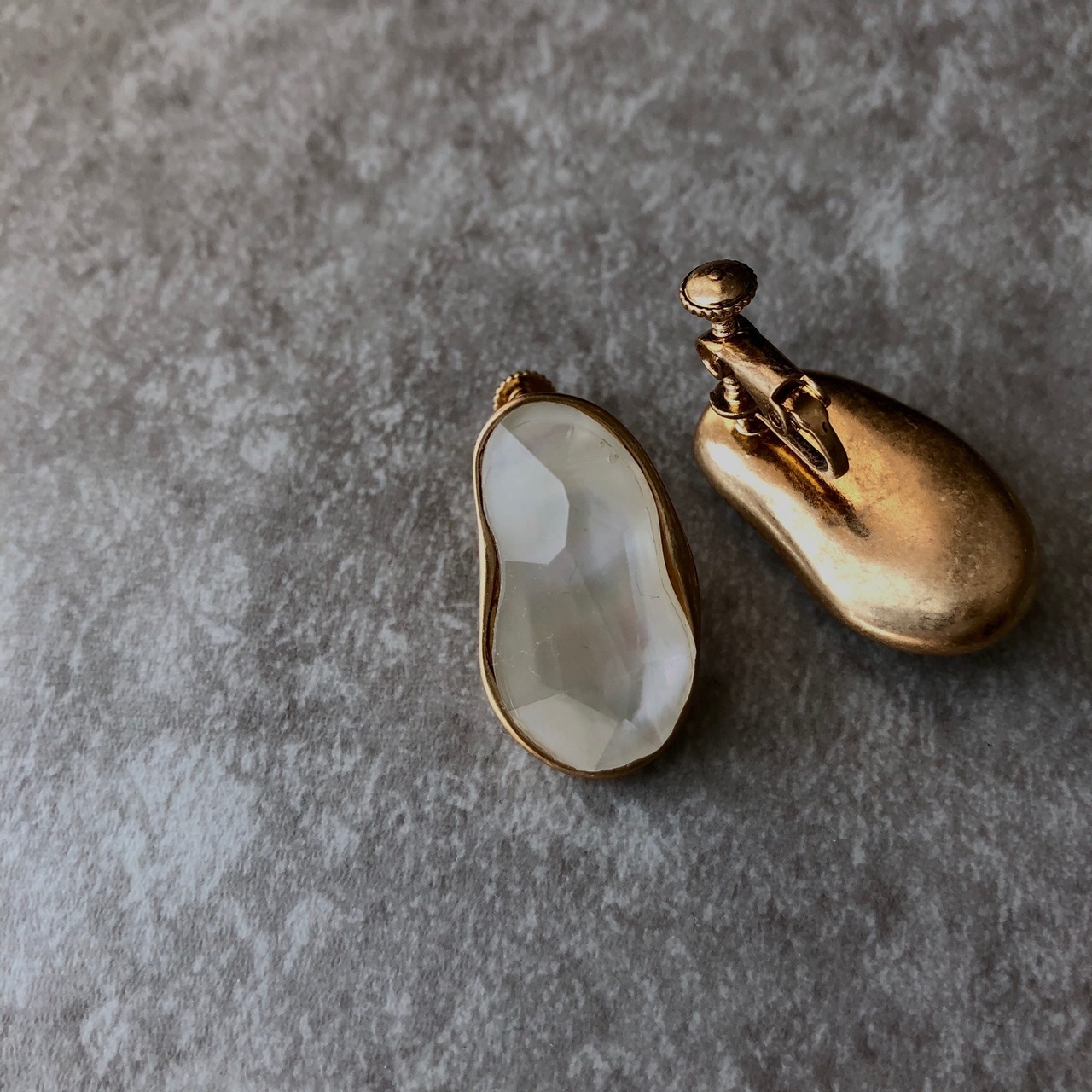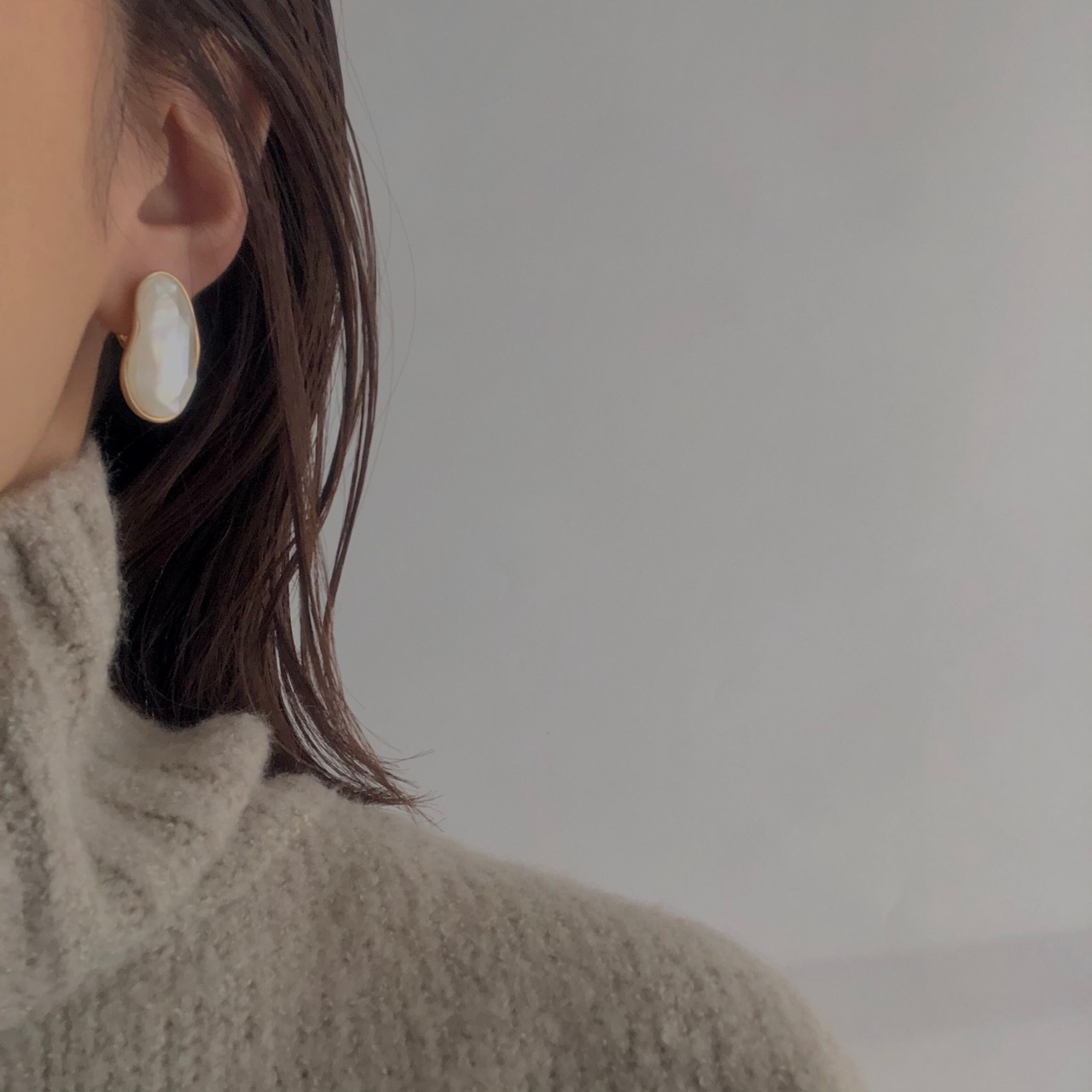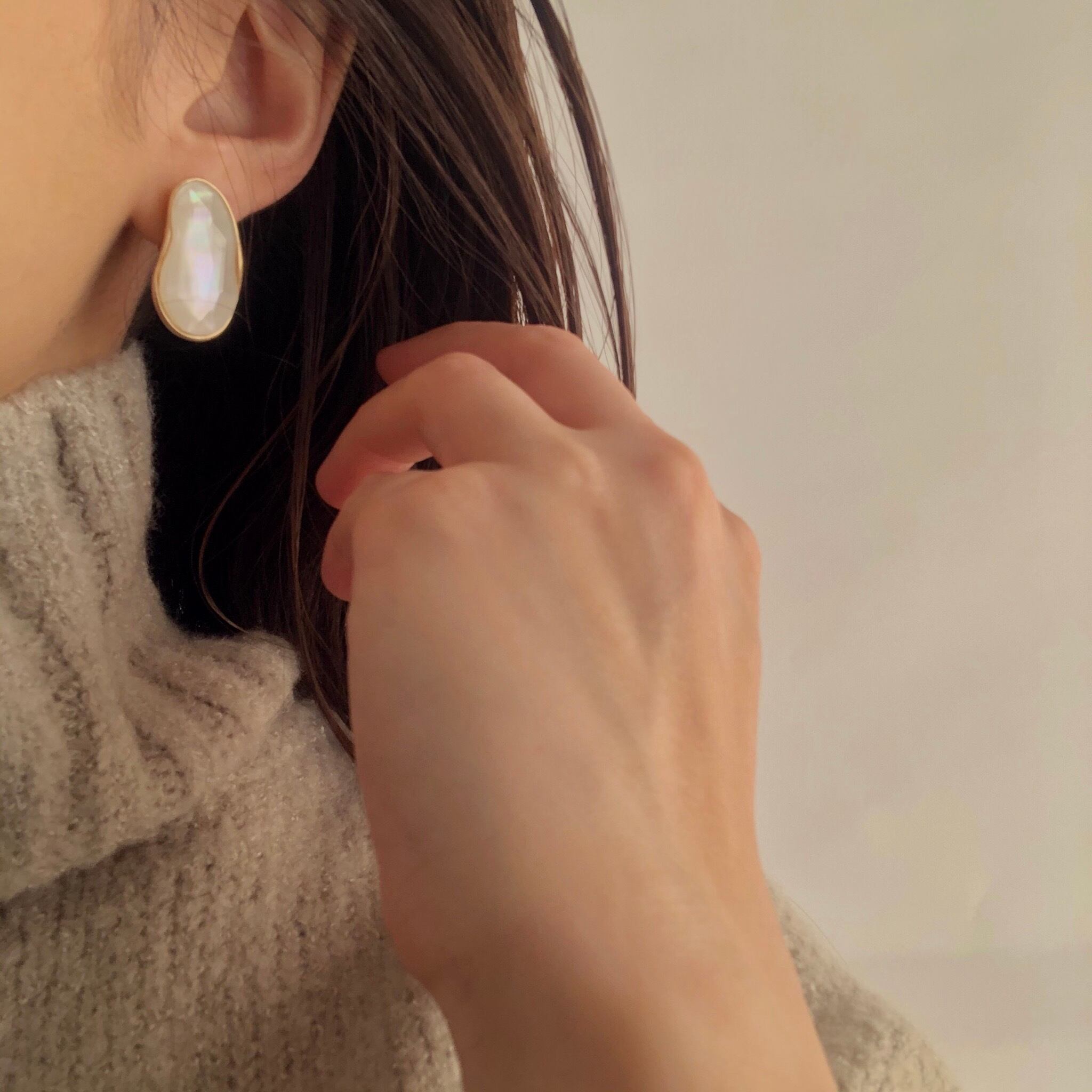 シェル風のイヤリング。マットゴールドのフレームで甘くなり過ぎず大人っぽいデザインに仕上がっています。