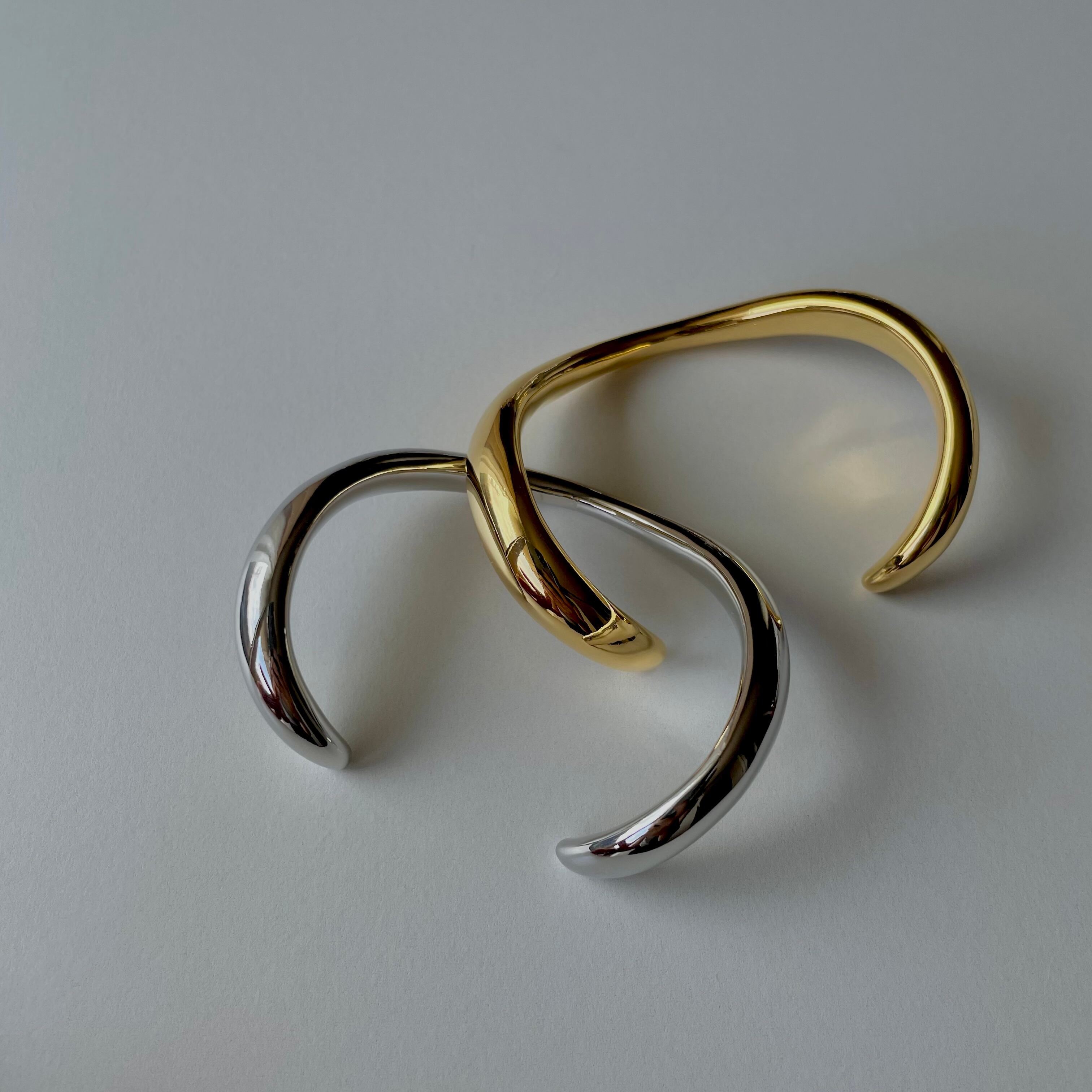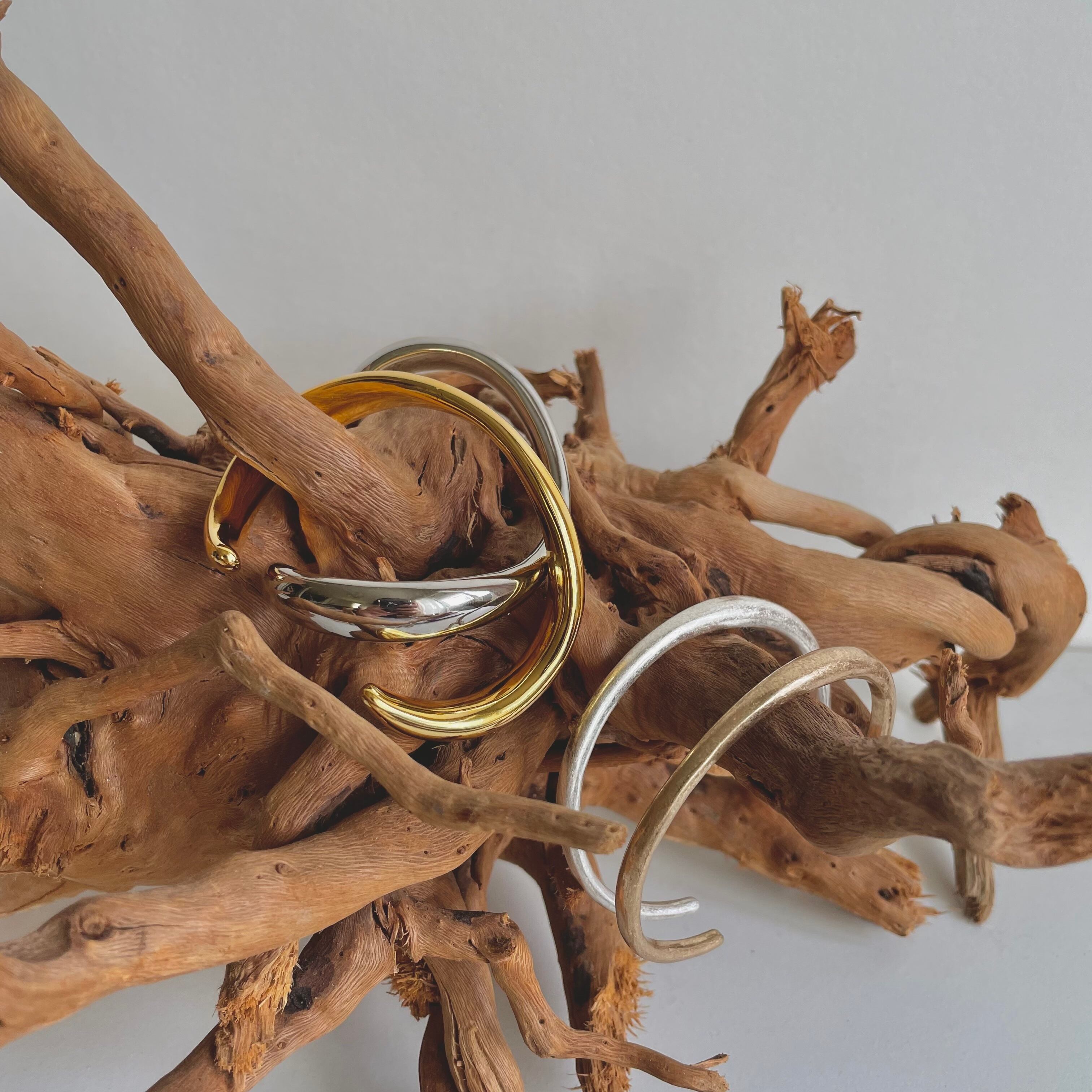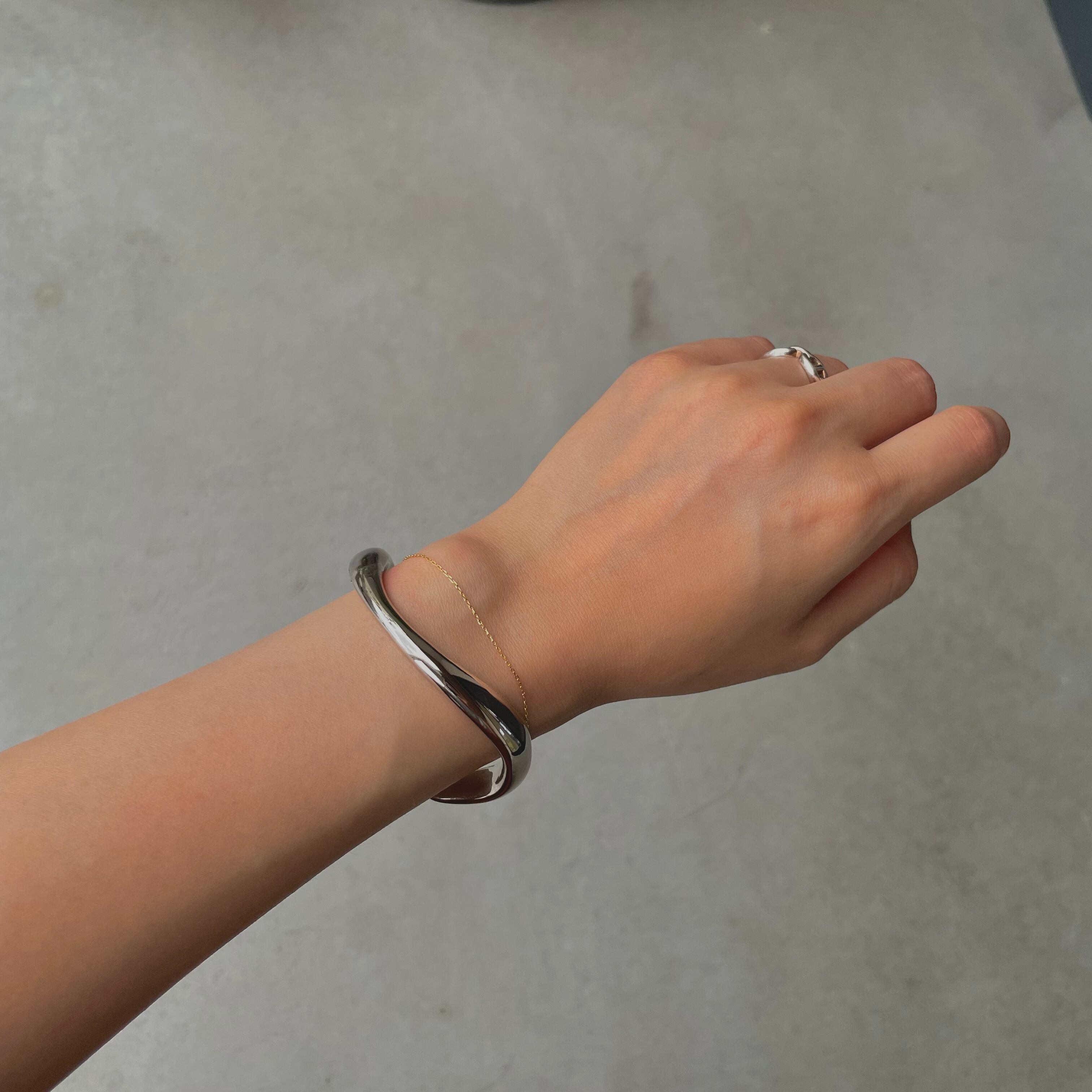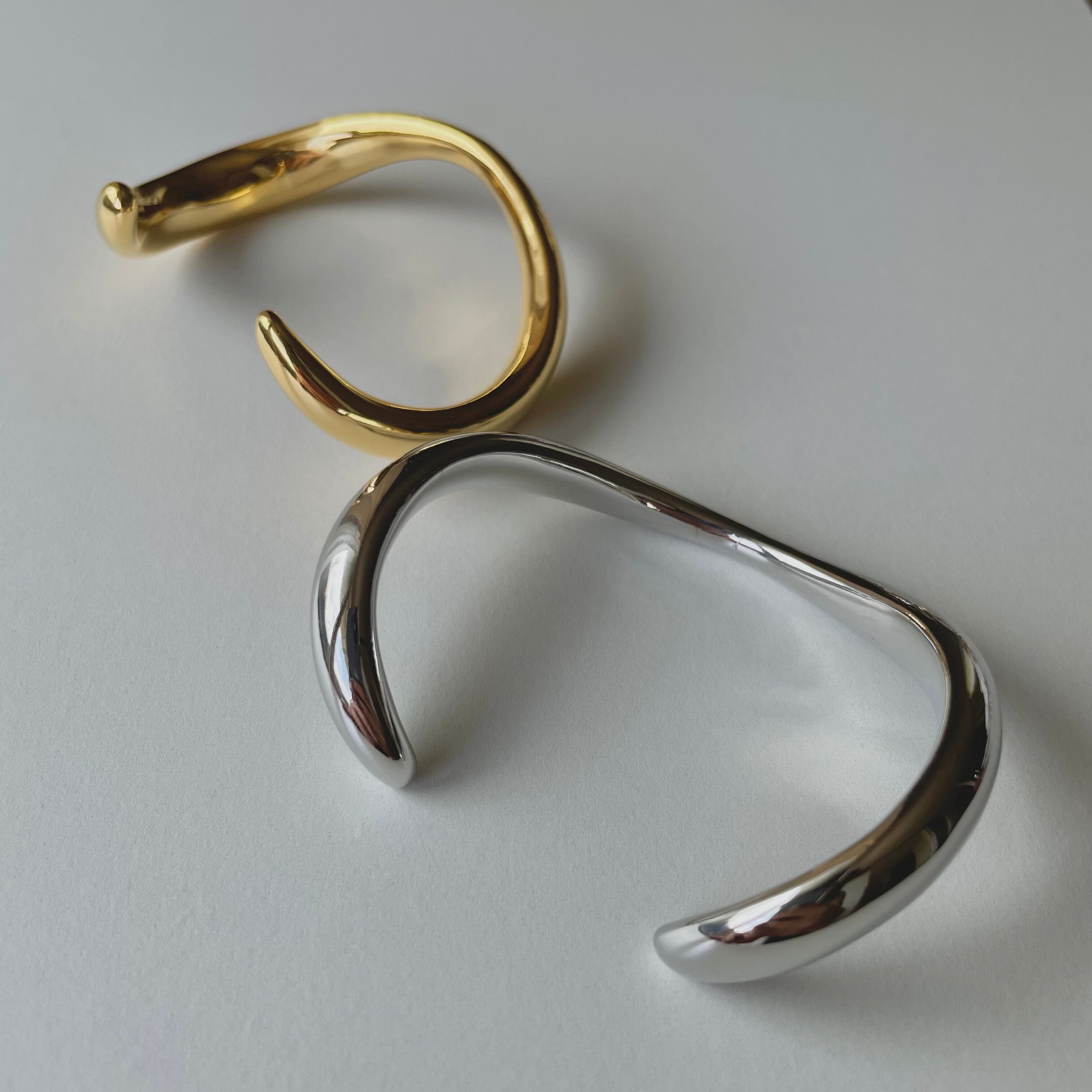 ウェーブデザインのバングルは素肌にはもちろん、お洋服の袖の上からも着用していただきたいアイテムです。間口は多少のサイズ調整が可能です。