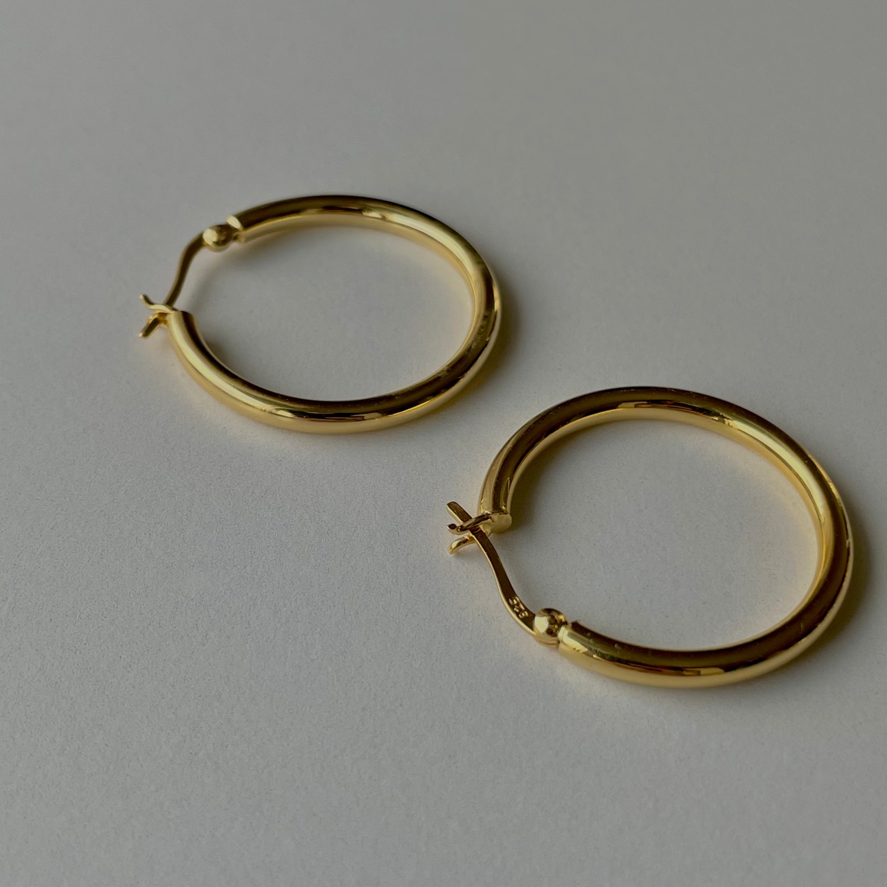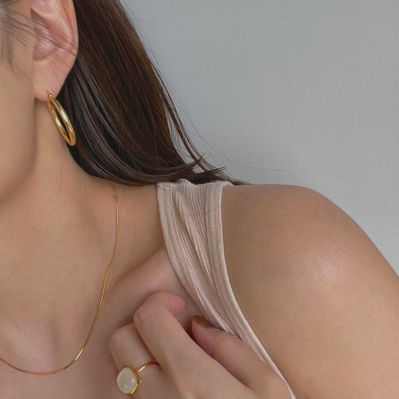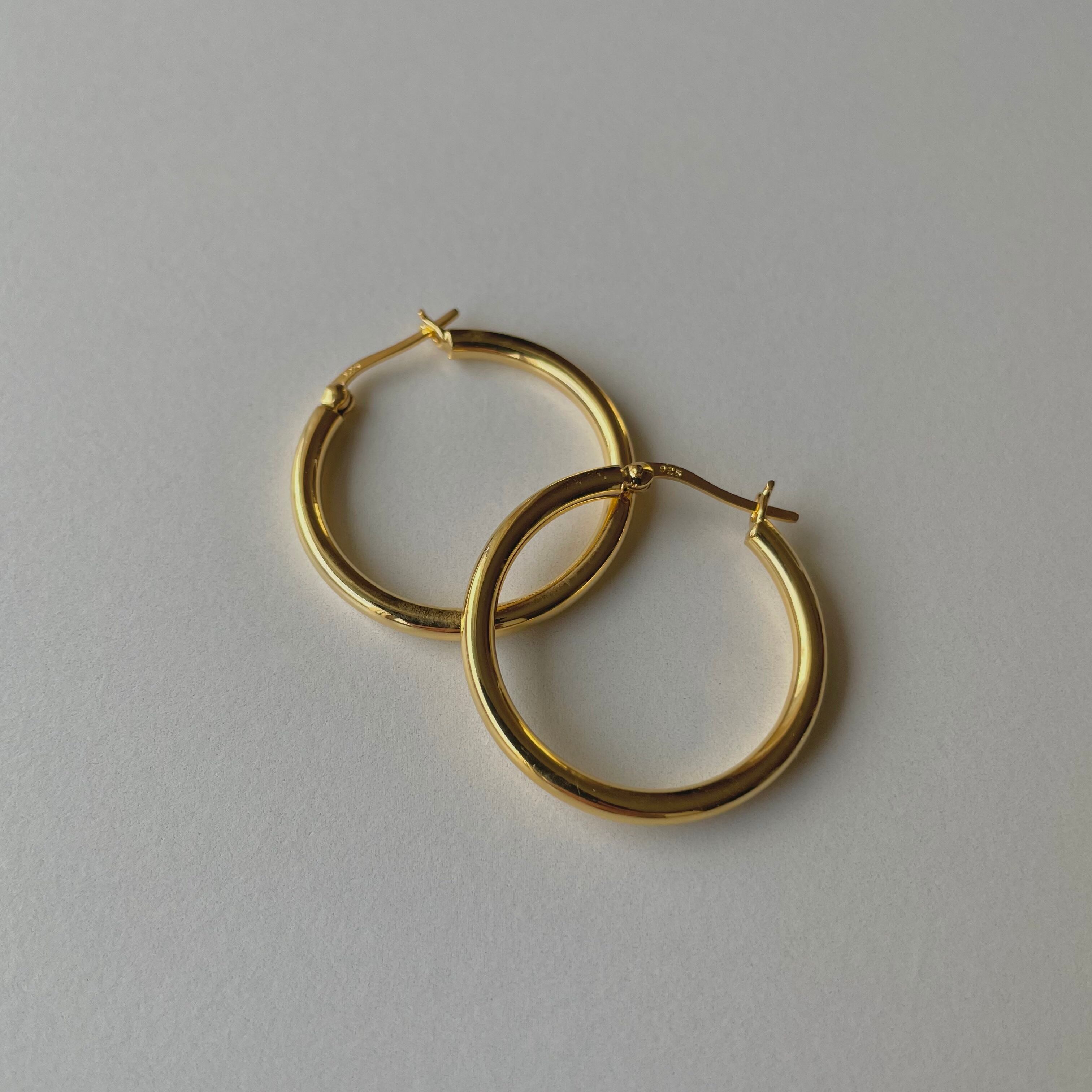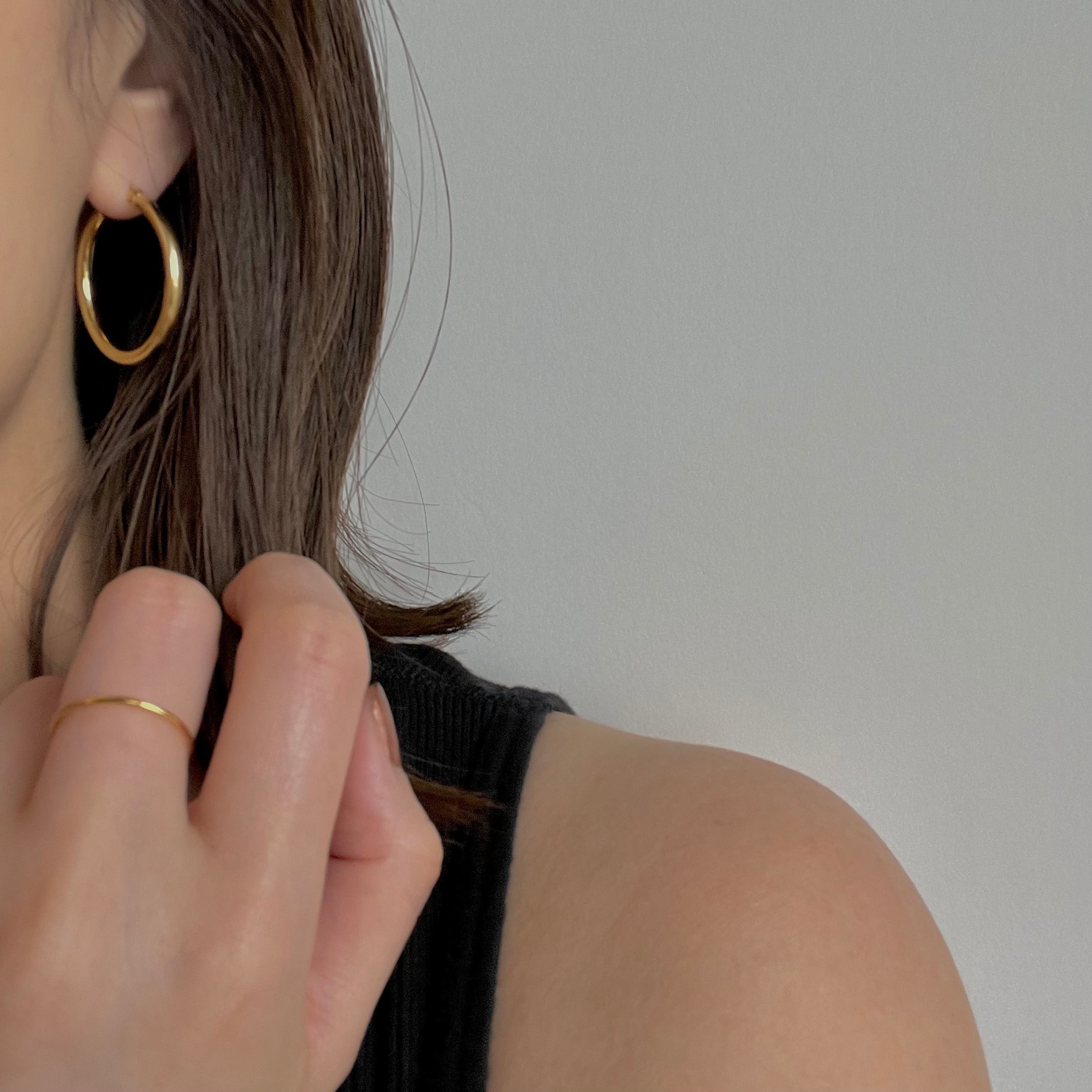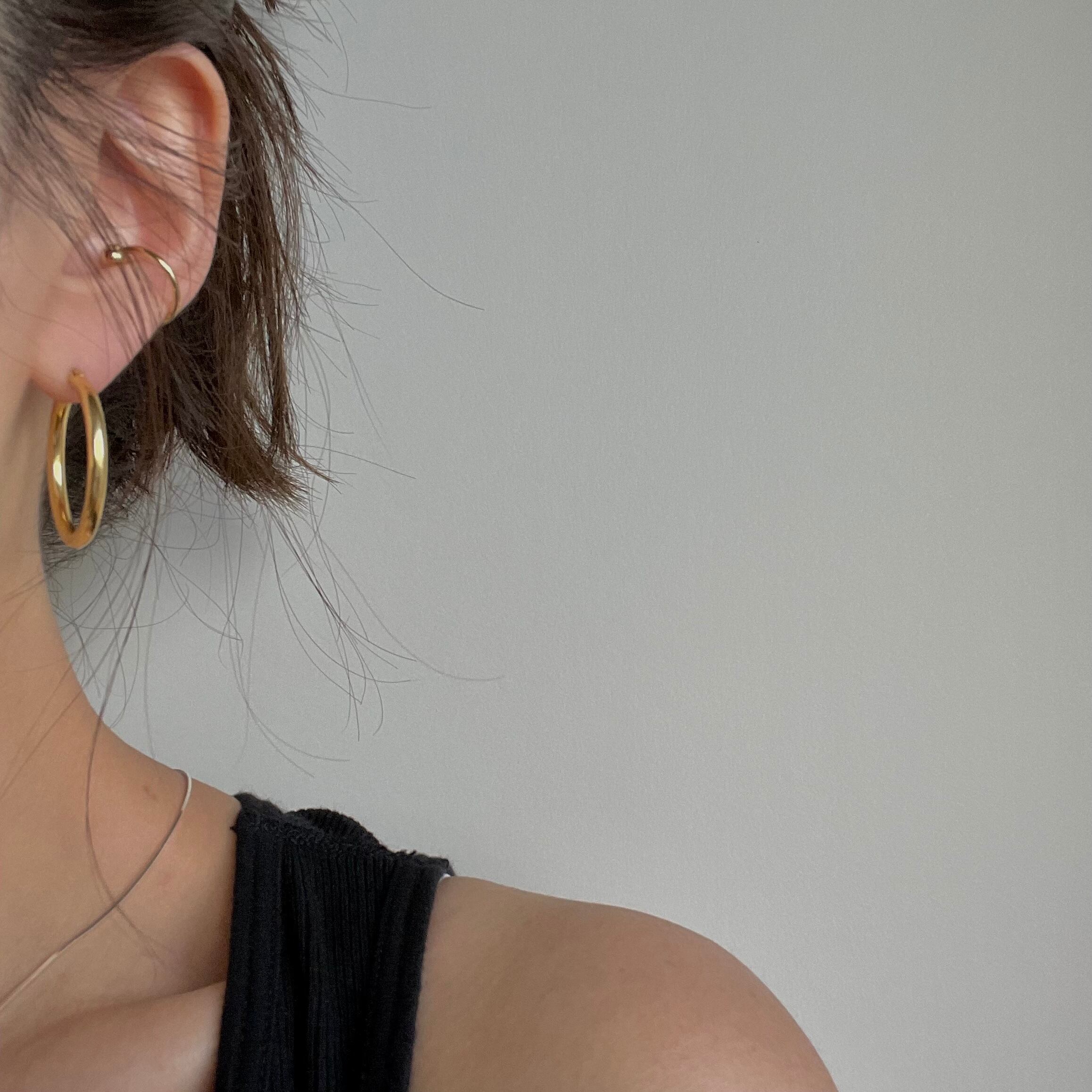 細めのフレームですっきりとした印象のフープピアス。直径3cmはカジュアルになりすぎない綺麗めな雰囲気に見せてくれる絶妙なサイズ感です。