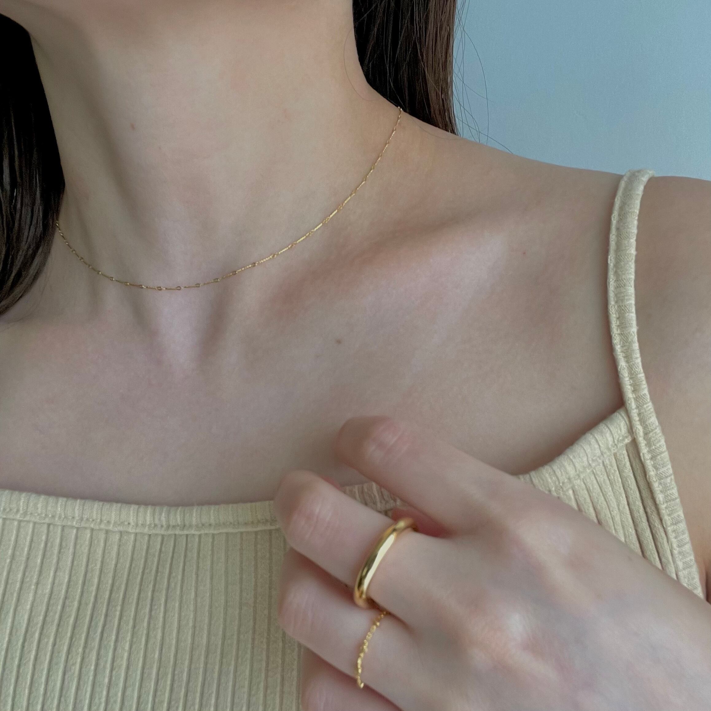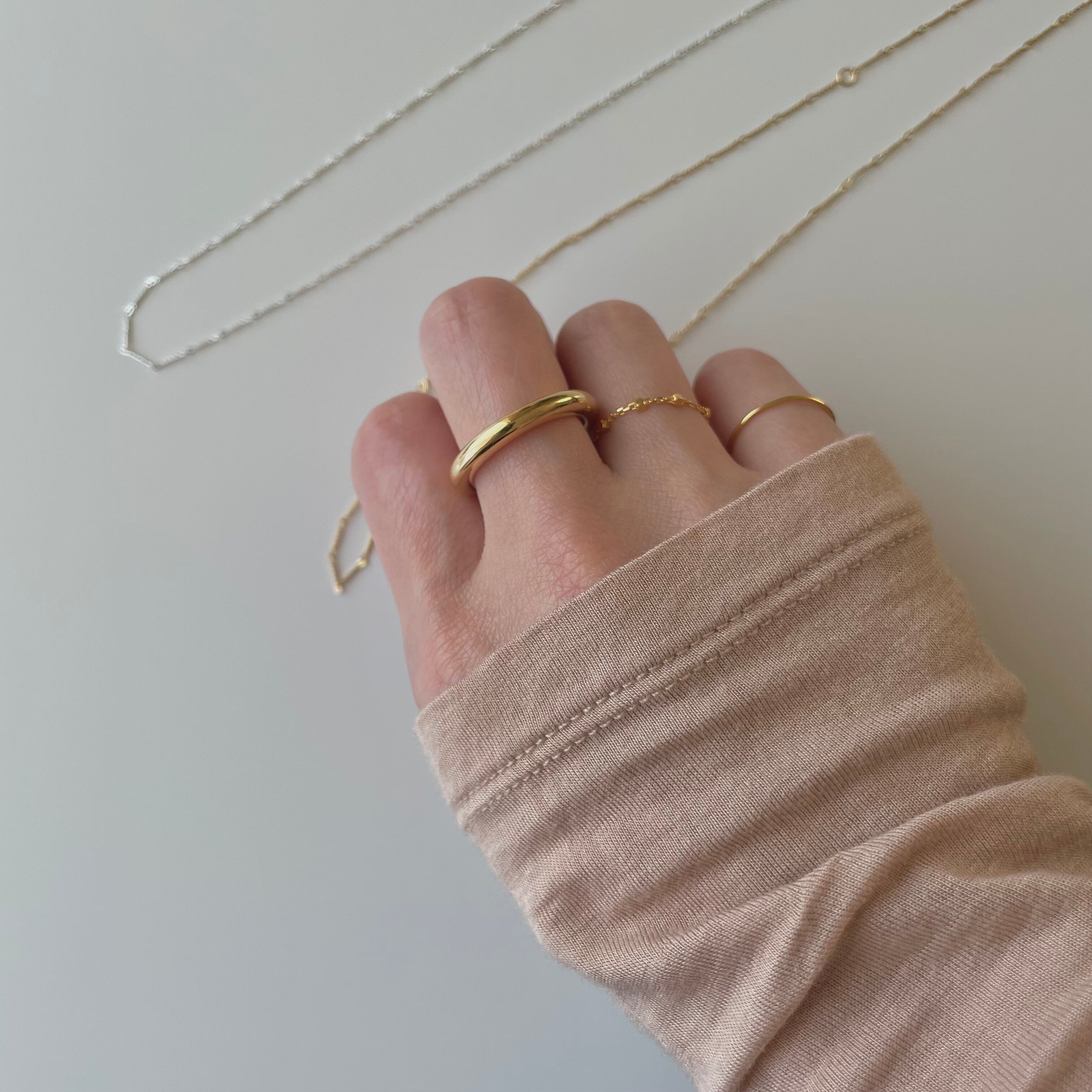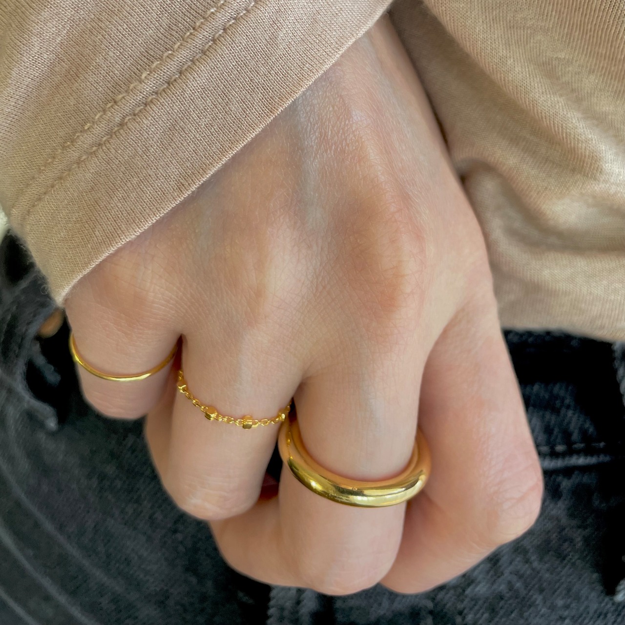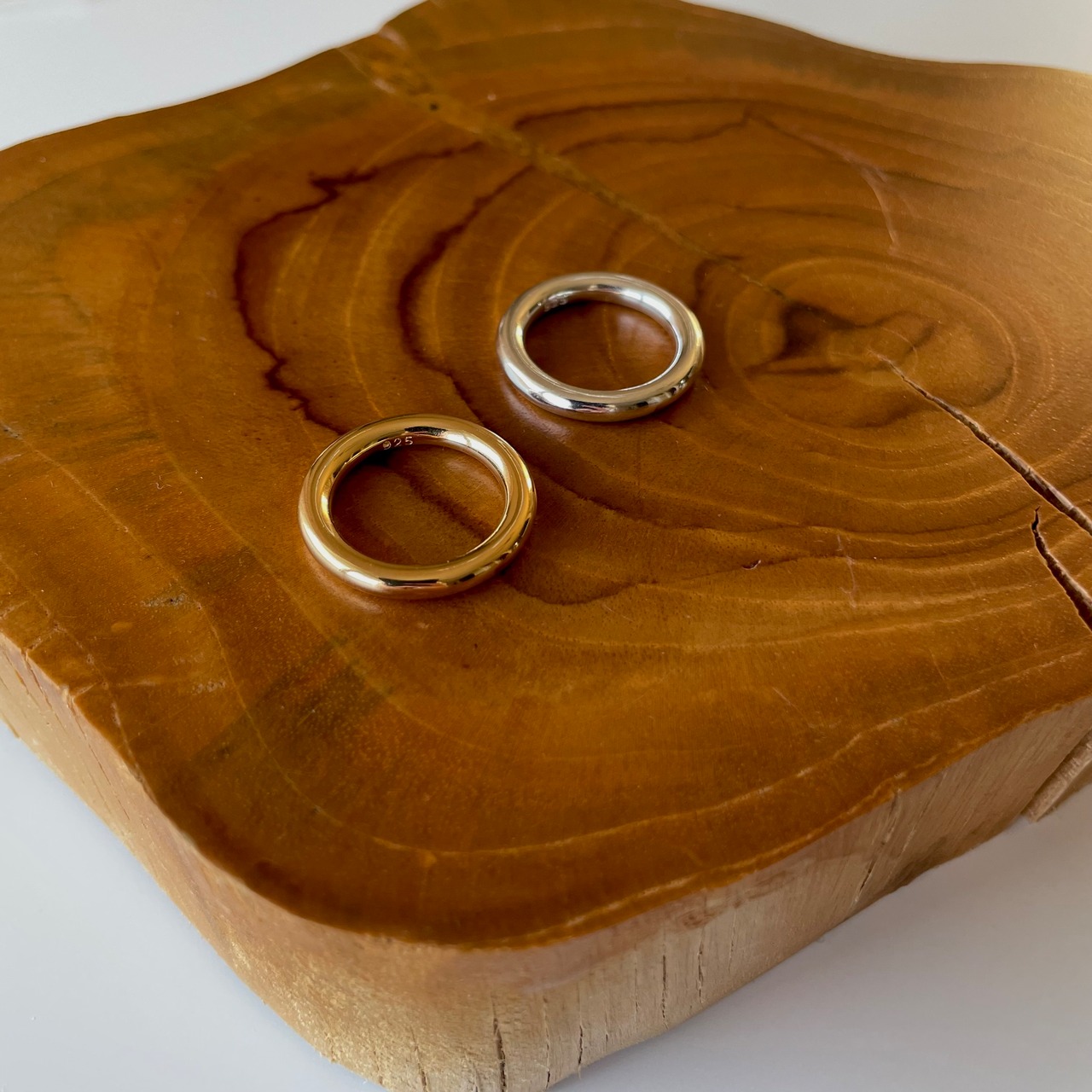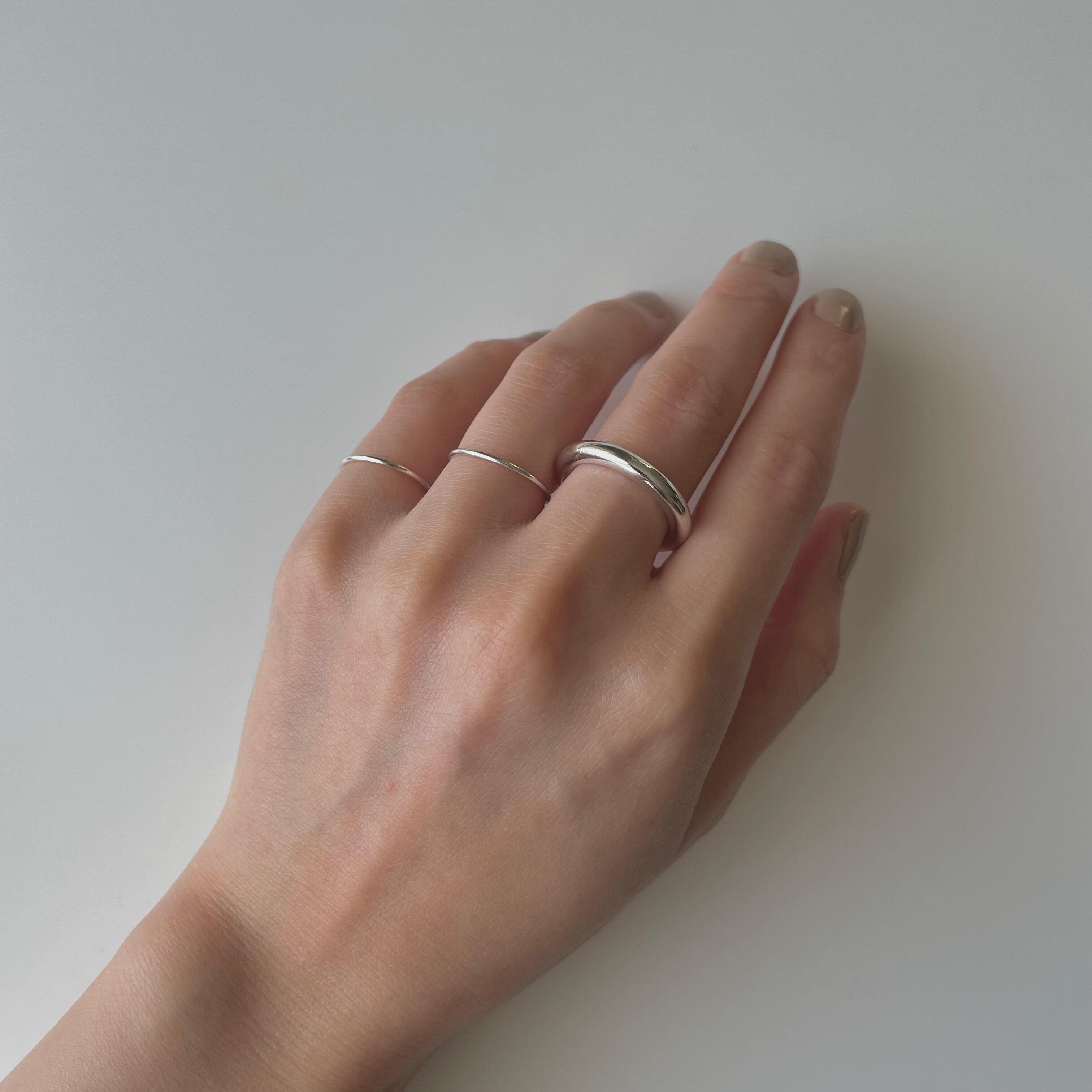 ぷっくりした見た目が可愛いリング。サイズ感にこだわった太すぎない幅は1つでも存在感がしっかり出ます。また925 t ringのような細いリングを指違いでご着用されると対比が演出できるのでおすすめのコーディネートです。