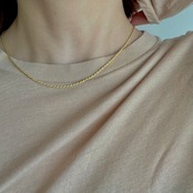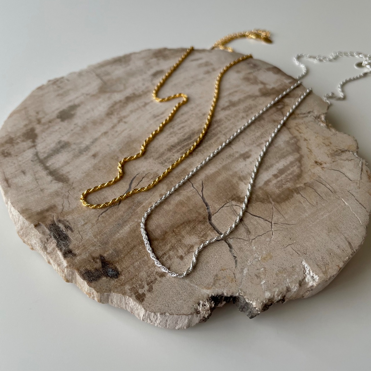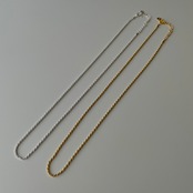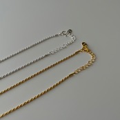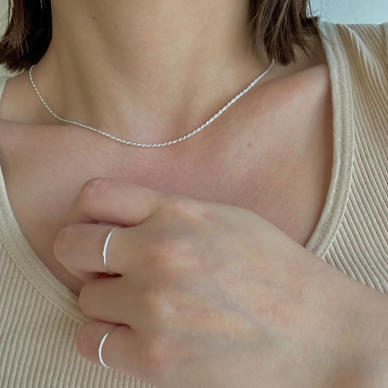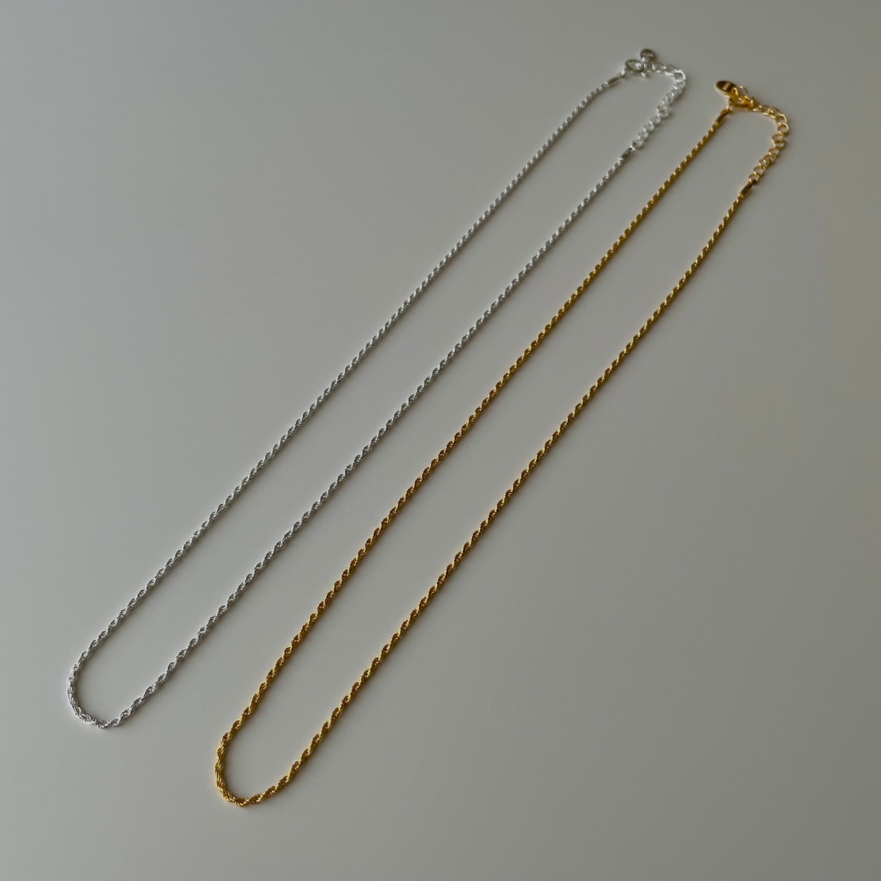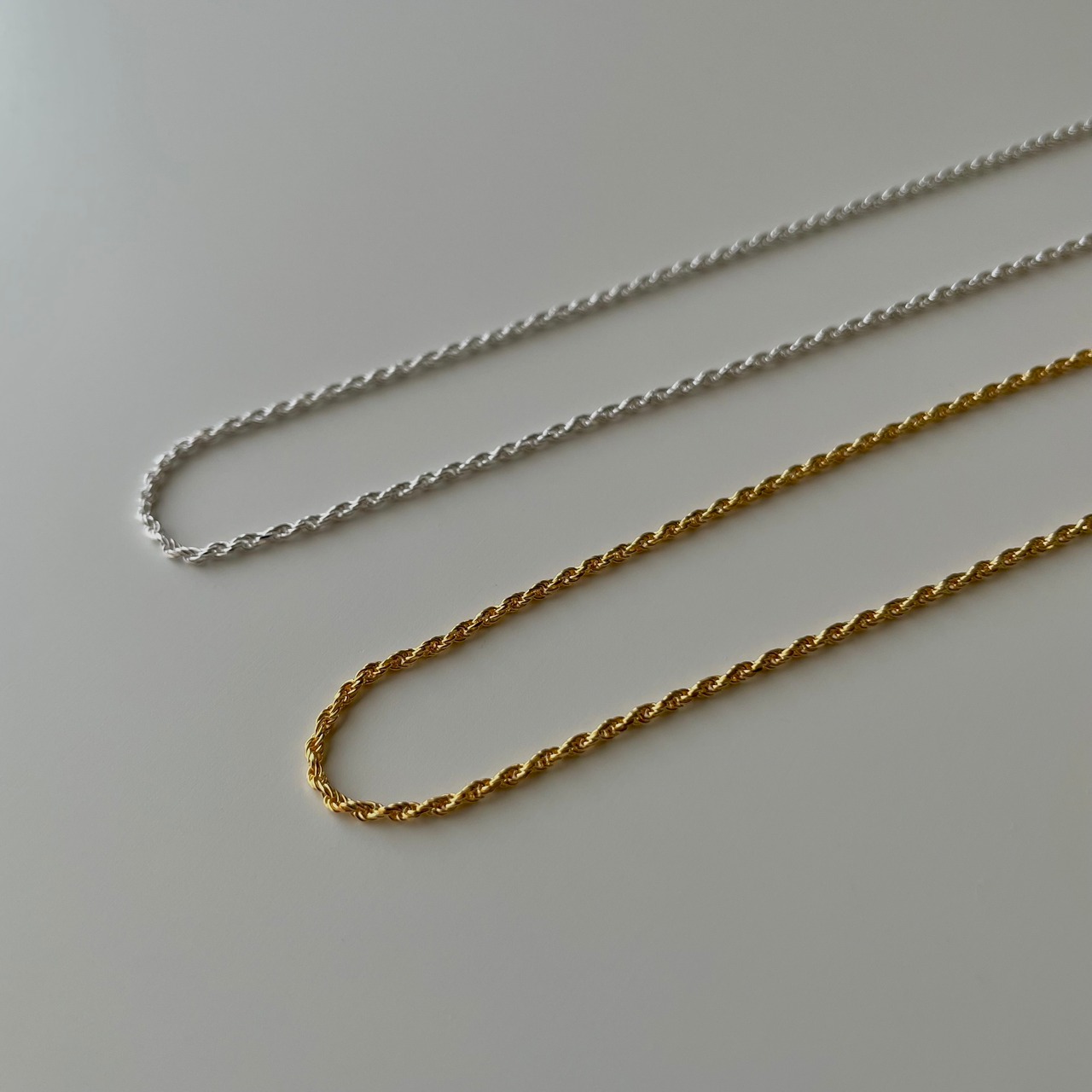 存在感のあるロープチェーンを細めに仕上げ、ボリュームを抑えてすっきりと合わせやすいデザインに。複雑に編み込まれた表面の反射をお楽しみください。