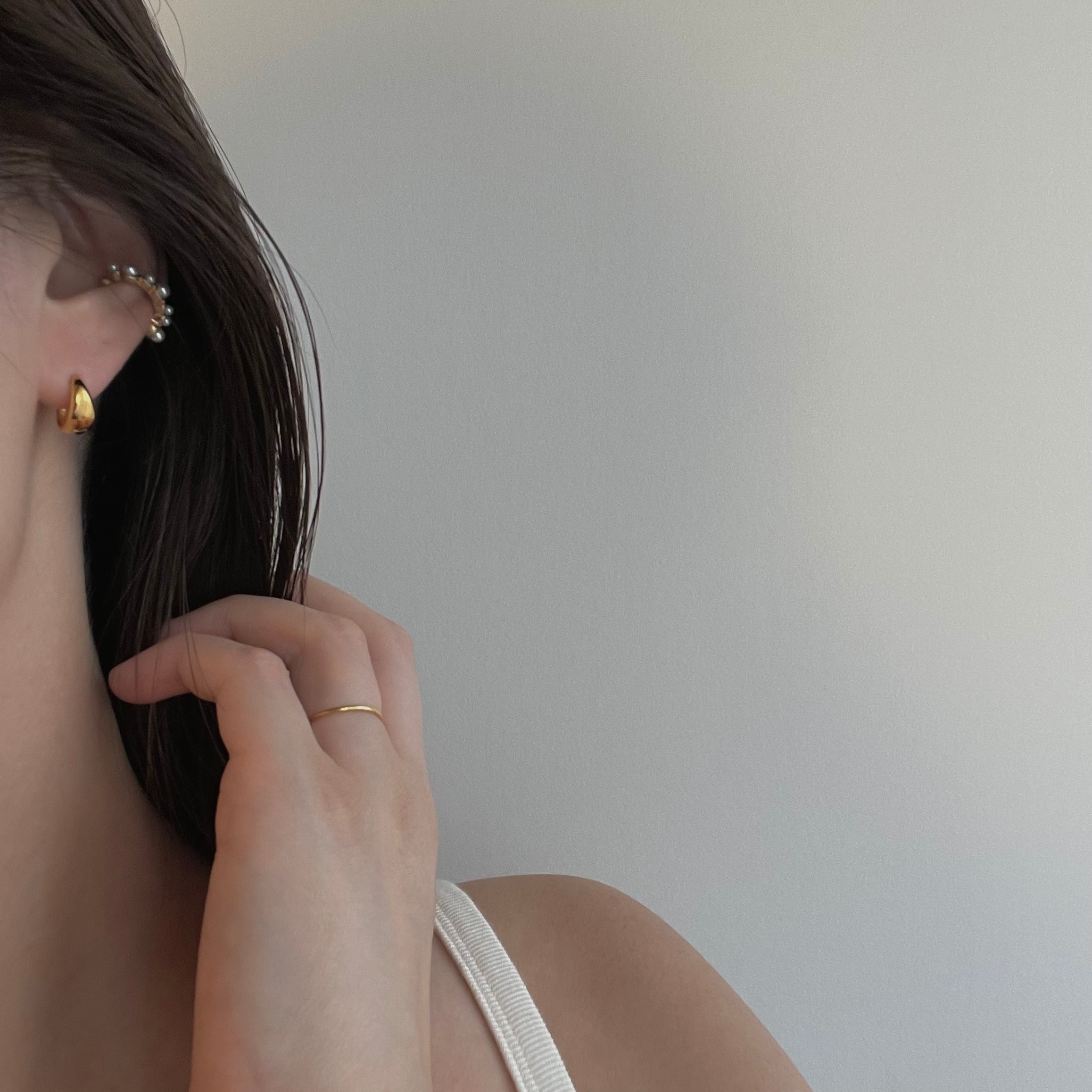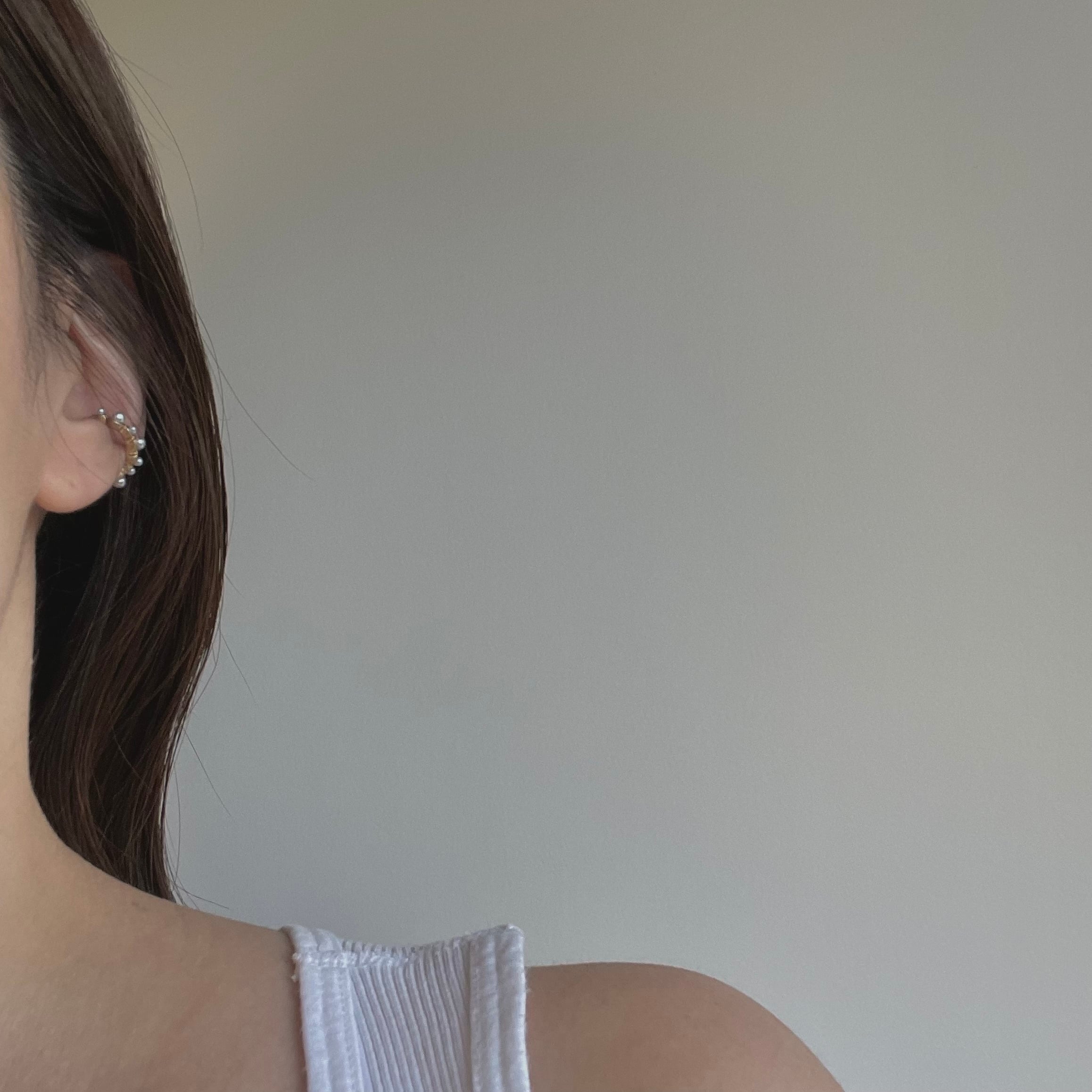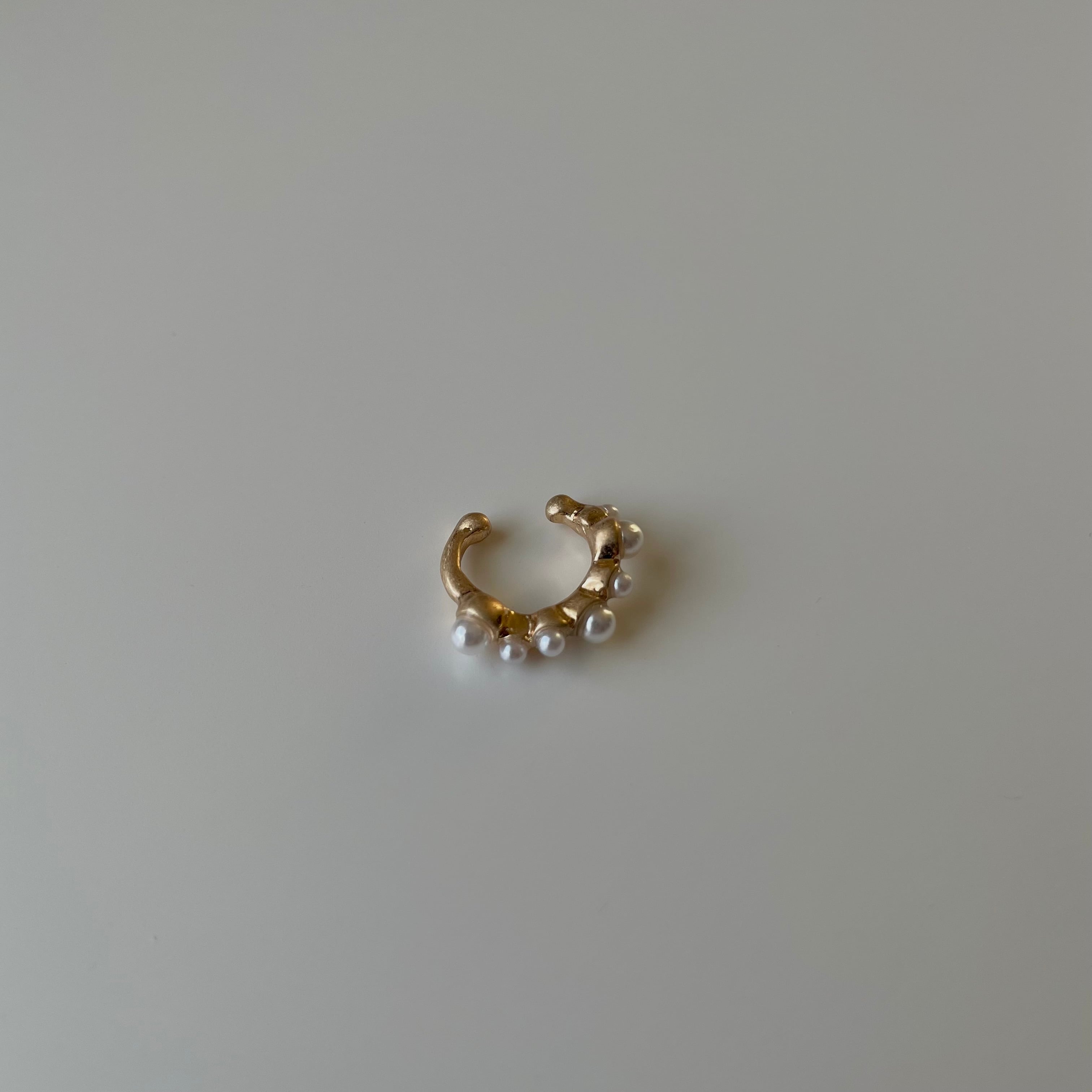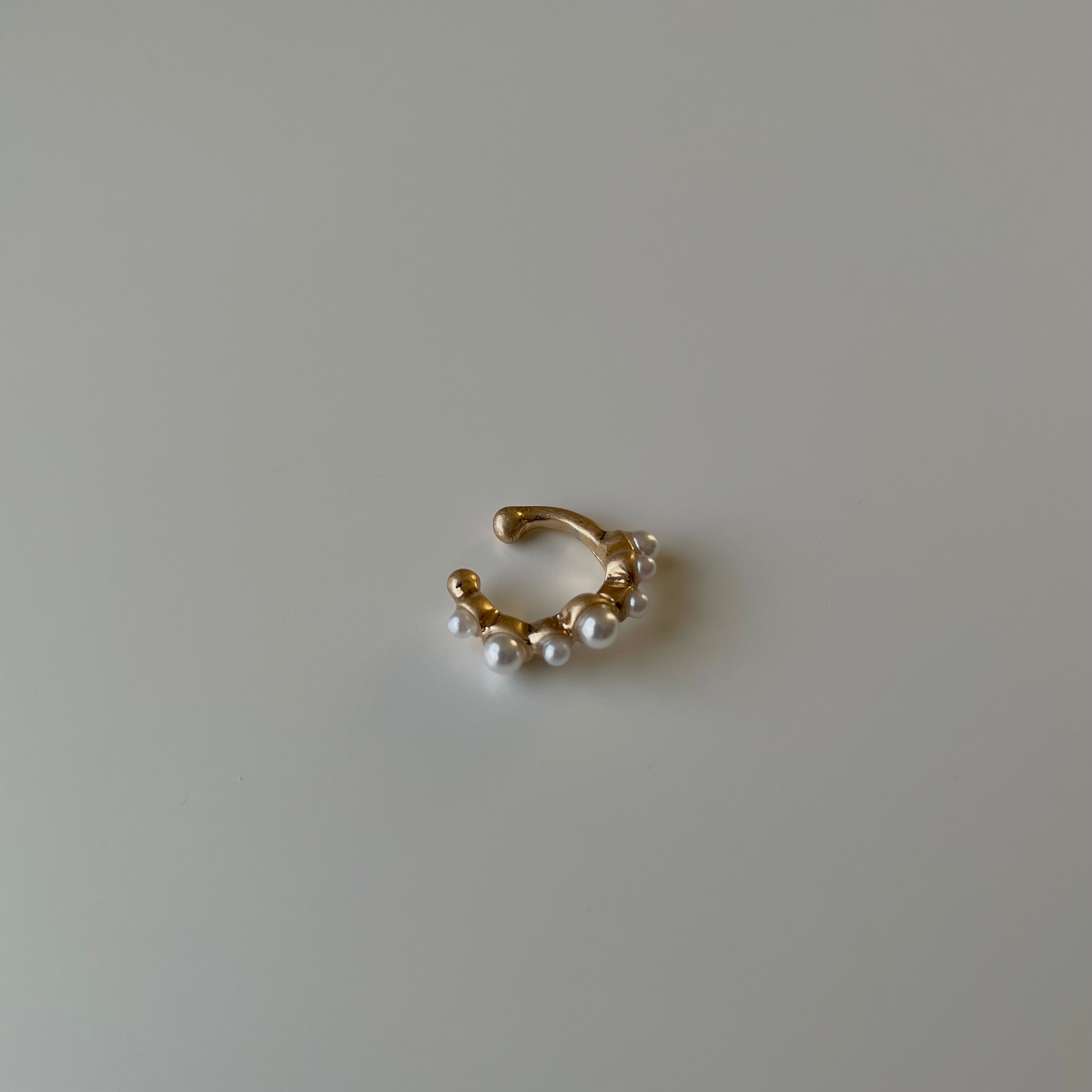 パールモチーフが不規則にあしらわれたミニサイズのイヤカフ。くすみゴールドとパールモチーフの組み合わせが耳元のアクセントに。